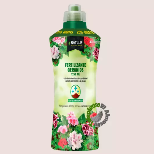 Batlle Fertilizante Geranios 1250 ml es un complejo nutritivo de alta absorción y rápida respuesta, formulado con una estudiada proporción nutritiva que proporciona un desarrollo óptimo en la época de crecimiento de la planta y una oración exuberante y duradera en la época de oración.
