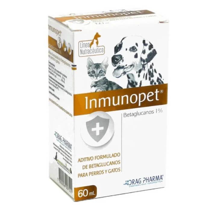 Inmunopet® (60ml) de Laboratorio Drag Pharma es un suplemento nutricional en suspensión oral, especialmente formulado para fortalecer y modular el sistema inmunológico de perros y gatos. Su completa fórmula contiene una mezcla balanceada de Vitaminas (A, D3, E, C, Complejo B), Minerales con acción antioxidante (Zinc, Selenio) y Aminoácidos esenciales (Lisina, Metionina). Está indicado como apoyo en mascotas con defensas bajas, durante periodos de estrés, convalecencia post-enfermedad o cirugía, y para optimizar la respuesta inmune en cachorros, gatitos y animales senior.